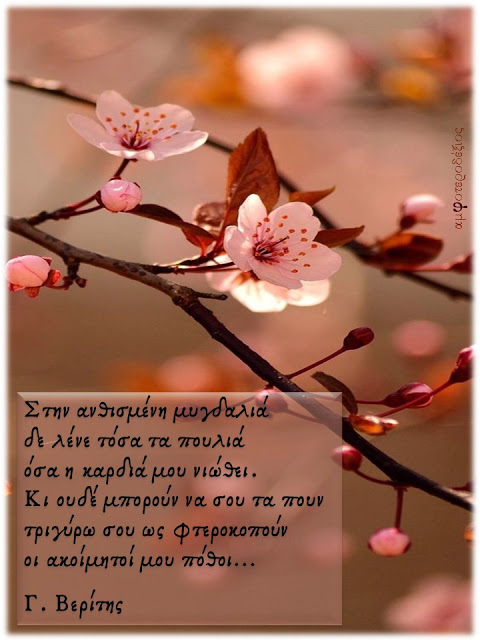 Posted on 4 Μαρτίου, 2019 από melissoulesΣτην ανθισμένη αμυγδαλιά δεν λένε τόσα τα πουλιά.. Κοινοποιήστε: Κάνε κλικ για να μοιραστείς στο X(Ανοίγει σε νέο παράθυρο) Χ Πατήστε για κοινοποίηση στο Facebook(Ανοίγει σε νέο παράθυρο) Facebook Μου αρέσει! Φόρτωση... Σχετικά