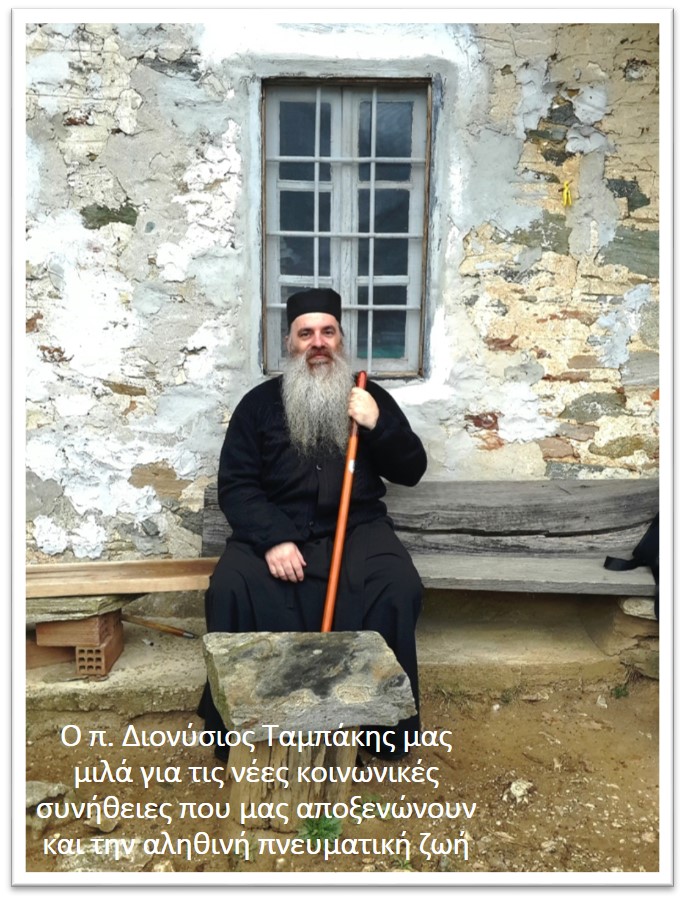 Ο τρόπος που λειτουργεί η επικοινωνία στο διαδίκτυο ωθεί τον άνθρωπο σε κατώτερα ένστικτα. Οι νέοι μας με την απειρία τους, αλλά και οι μεγαλύτεροι με την παγίωση των ετών στην κακή συνήθεια γινόμαστε άνθρωποι του προσωπείου. Ο πατήρ Διονύσιος θα συμφωνήσει:«Όμως ας προσέξουμε, διότι όταν φοράς για πολύ μία μάσκα μετά ξεχνάς ποιος είσαι.Θα σας μιλήσω για τον πνευματικό άνθρωπο. Αυτός κατέχει μέσα του τη ζωντάνια του Αγίου Πνεύματος και όπου σταθεί σκορπά γύρω του χαρά, κάμνοντας τους διπλανούς του να αναπνέουν καλύτερα, ενώ ο υλικός είναι πνιγηρὸς καὶ κουραστικὸς, η καρδιὰ του πόρρω απέχει απὸ τὸν Χριστό (βλ. Μάρκ. ζ΄, 6).»Δεν θα γινόταν παρά να σκεφτούμε τον χαμένο χρόνο που δεν επιστρέφει, αυτόν που σπαταλιέται ανεπανόρθωτα μπροστά στην οθόνη ενός υπολογιστή, πίσω από την προσωπική ιστορία του καθενός μας και την αλλοιώνει. Ρωτάμε τον π.Διονύσιο και μας δηλώνει με σαφήνεια:«Ο χρ-όνος είναι όνος που πρέπει να τον χρησιμοποιούμε και όχι να μας χρησιμοποιεί. Όπως λέγει ο Χριστός μας στο Ευαγγέλιο: “Το Σάββατο για τον άνθρωπο εγένετο ουκ ο άνθρωπος για το Σάββατο.” Και ο χρόνος λοιπόν για τον άνθρωπο έγινε και όχι ο άνθρωπος για τον χρόνο. Σήμερα όμως ενώ οι άνθρωποι νομίζουν πως τον διαχειρίζονται δημιουργικά, στην πραγματικότητα τον αχρηστεύουν, αφού οι πράξεις τους δεν παράγουν αιωνιότητα αλλά καρπούς πρόσκαιρους. Έτσι παίρνει αξία ο χρόνος όταν υπηρετεί την αιωνιότητα. Να επιθυμούμε να ζούμε πολλά χρόνια, όχι για καλοπέραση και ευημερία μόνο, αλλά για να μας δώκει ο Κύριός μας χρόνο για να μετανοήσουμε περισσότερο με βαθιά μετάνοια. Τότε έχει αξία ο χρόνος όταν με την μετάνοια, μας προετοιμάζει για την αιωνιότητα και αθανασία. Διότι και εκατό ετών να φτάσεις, όταν είσαι μέσα στην αμαρτία τότε κατάφερες μόνο μία τρύπα στο νερό. Γι’ αυτό και όταν ρωτάς τον ευλογημένο παπα-Κύριλλο: “πόσα χρόνια έχεις πάτερ καλόγερος;” σου απαντά: “Σαράντα, μα αρετή καμία”.»
