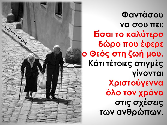 Ένα γράμμα έστω, ένα λουλούδι, ακόμα και μια σοκολάτα. Είτε είστε νέοι, είτε με ρυτίδες. Να του πεις ή να της πεις ότι είναι το καλύτερο δώρο που έφερε ο Θεός στη ζωή σου. Κάτι τέτοιες στιγμές γίνονται Χριστούγεννα όλο τον χρόνο στις σχέσεις των ανθρώπων. Κάτι τέτοιες στιγμές αξίζουν περισσότερο από όλα τα αναμμένα λαμπάκια στις μεγαλουπόλεις του κόσμου και από όλα τα φαγητά σε όλα τα τραπέζια του κόσμου. Μην ξεχνάς τον άνθρωπό σου και μην νομίζεις ότι δεν χρειάζεται ένα «σ’ αγαπώ». Σε αυτές τις στιγμές ποτίζεις τον γάμο με αγιασμό και συνεχίζει να ανθίζει.