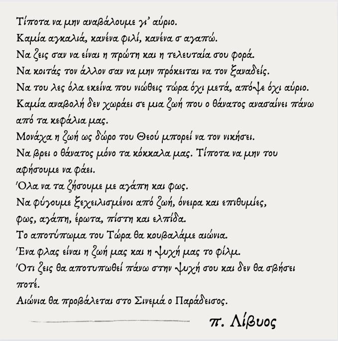 Posted on 22 Μαρτίου, 202321 Μαρτίου, 2023 από melissoulesΤΙΠΟΤΑ ΝΑ ΜΗΝ ΑΝΑΒΑΛΟΥΜΕ ΓΙΑ ΑΥΡΙΟ.. Κοινοποιήστε: Κάνε κλικ για να μοιραστείς στο X(Ανοίγει σε νέο παράθυρο) Χ Πατήστε για κοινοποίηση στο Facebook(Ανοίγει σε νέο παράθυρο) Facebook Μου αρέσει! Φόρτωση... Σχετικά